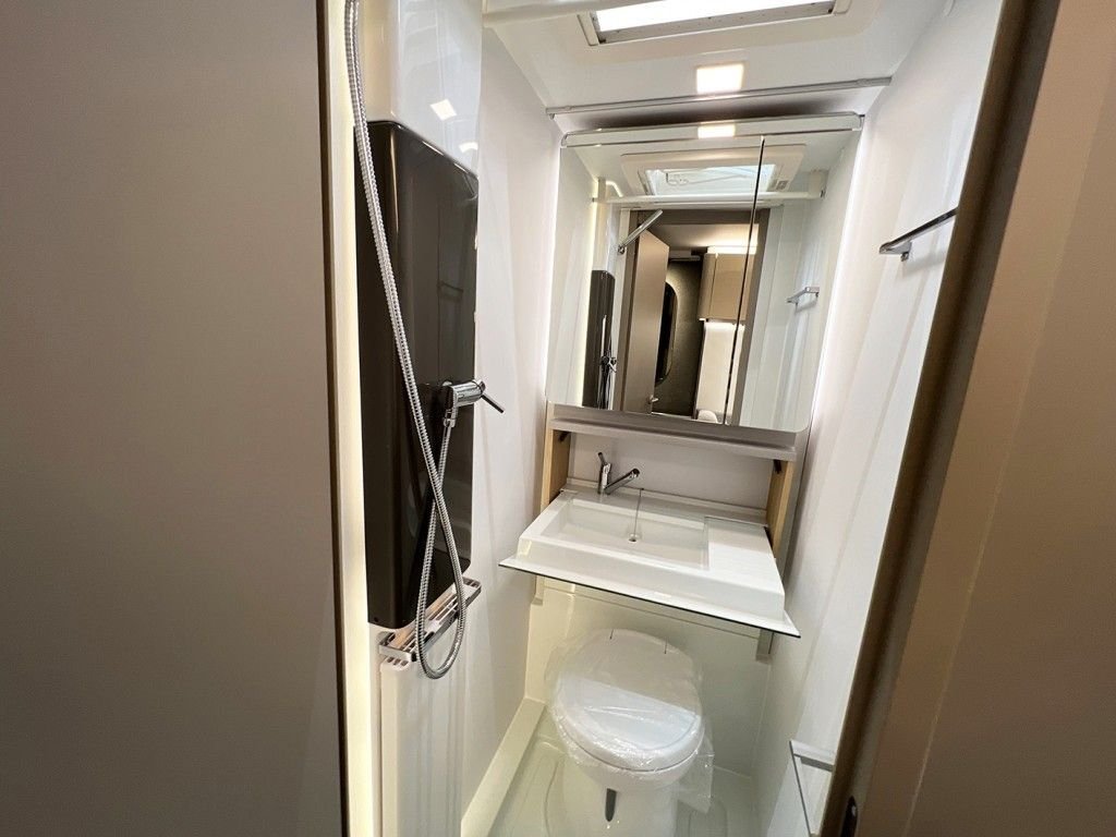 Im Schlafbereich befinden sich bequeme Einzelbetten, die für erholsamen Schlaf sorgen. Im Heck erstreckt sich ein großzügiges Badezimmer über die gesamte Fahrzeugbreite mit separater Dusche, Waschbecken und Toilette – ein echtes Komfort-Highlight