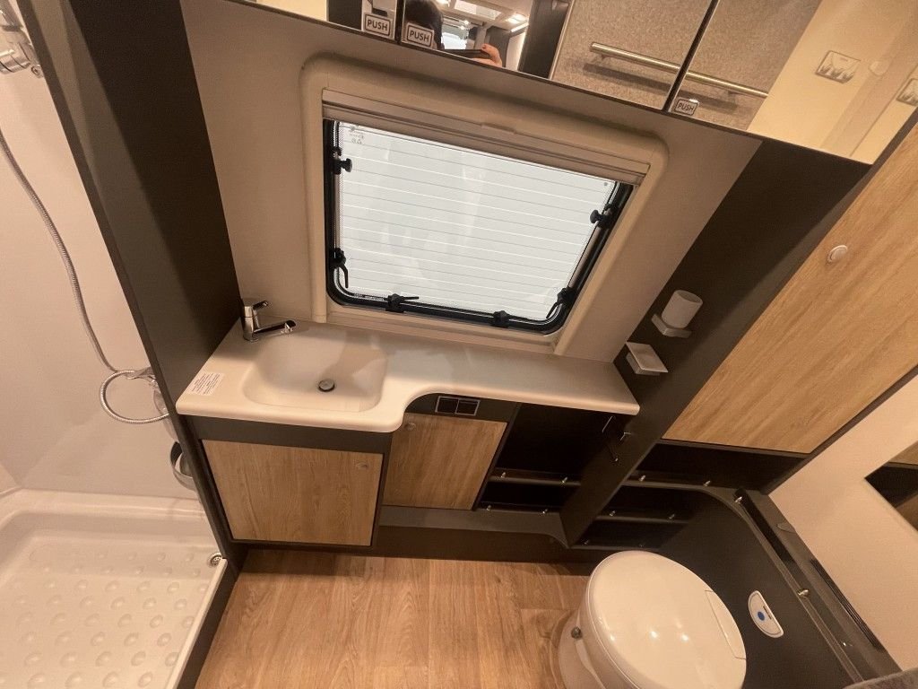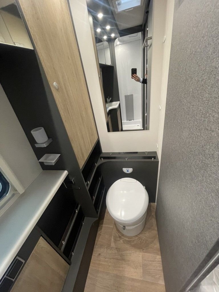 Das moderne Badezimmer verfügt über eine Toilette, ein Waschbecken und eine separate Dusche. Es bietet ausreichend Platz für alle persönlichen Utensilien und sorgt für hohen Komfort unterwegs.