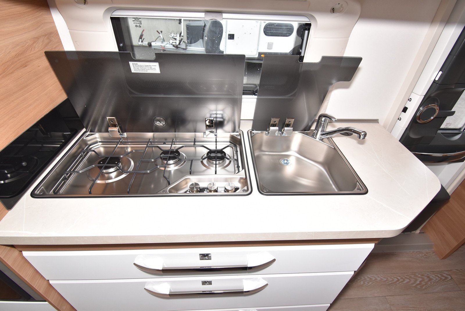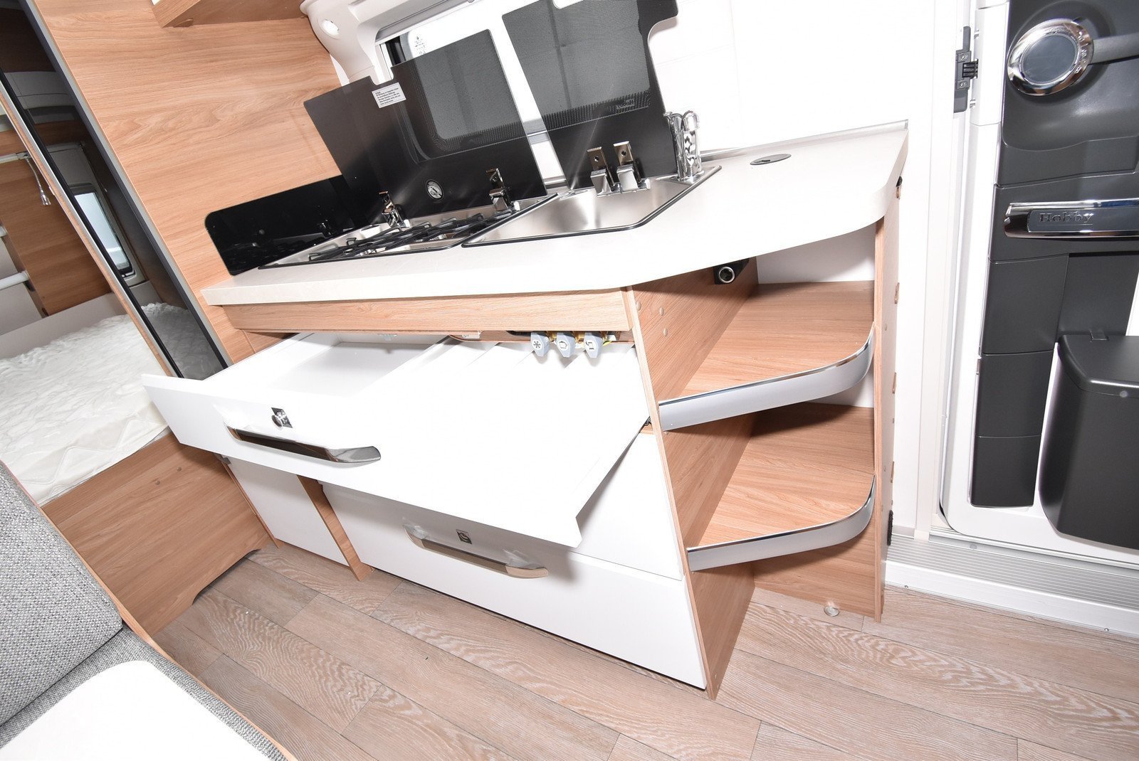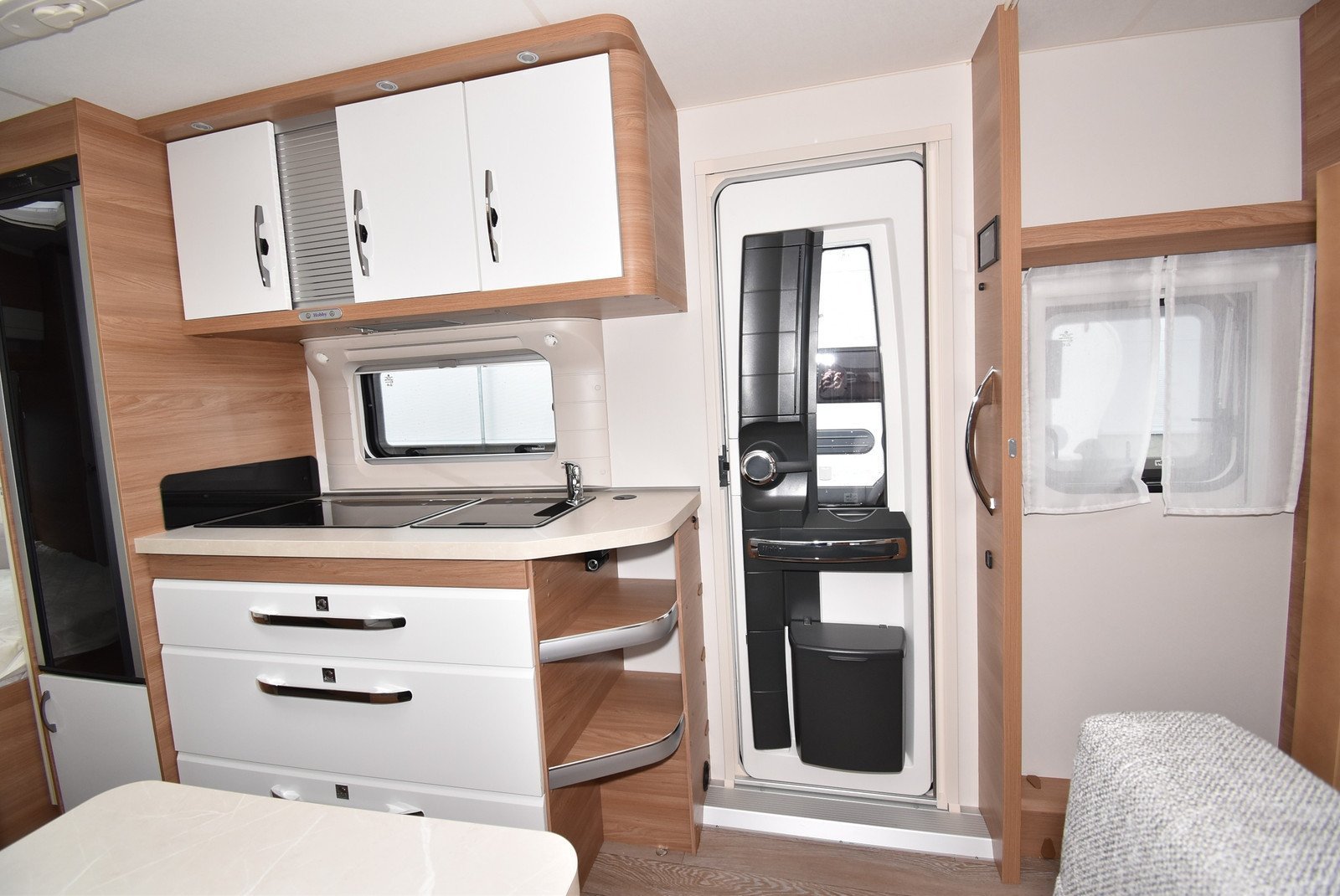 Der Wohnwagen verfügt über einen festen 47-Liter-Wassertank, Bettbezüge sowie Batteriematten. Die Gewichtserhöhung auf 1.750 kg ermöglicht eine bessere Zuladung und mehr Flexibilität beim Packen.