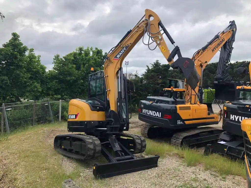 Neumaschine: Minibagger Technische Daten Typ: Minibagger Marke: Sany Modell: SY50U Baujahr: 2023 Gewicht: 5.000 kg (50 Doppelzentner) Zustand: Neuwertig / Neue Maschine Beschreibung Neue Maschine mit Kabine, Gummiketten, Planierschild, doppeltwirkender proportionaler Hammerleitung (BRH), doppeltwirkender proportionaler Drehleitung, mechanischem Schnellwechsler und 3 Tieflöffeln.
