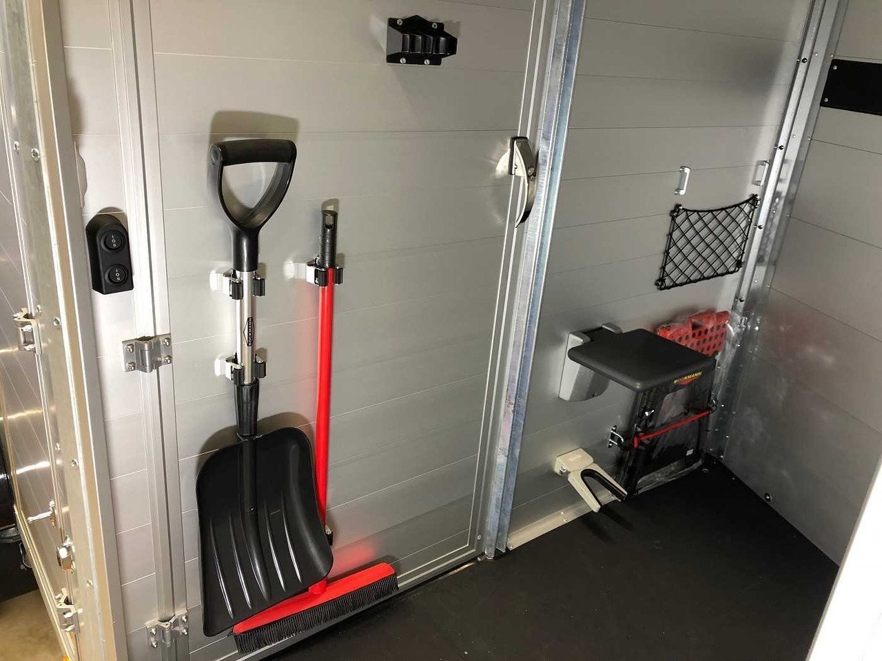 – Sellerie équipée de : Pelle et balai, porte bridon, div. crochets, porte récolte, deux grands casiers de rangement, filet de rangement, miroir et siège rabattable y compris chausse-bottes